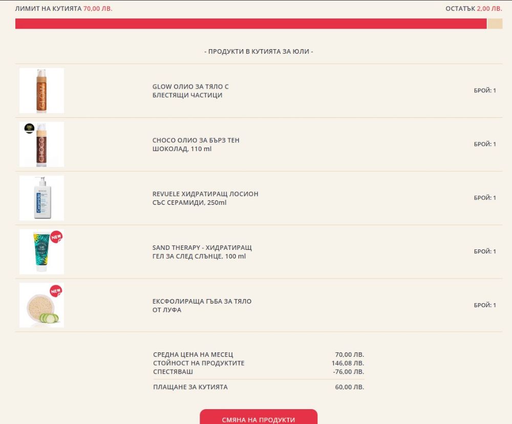 Най-отдолу на страницата, под продуктите, се визуализира бара, който показва до колко е запълнена кутията.