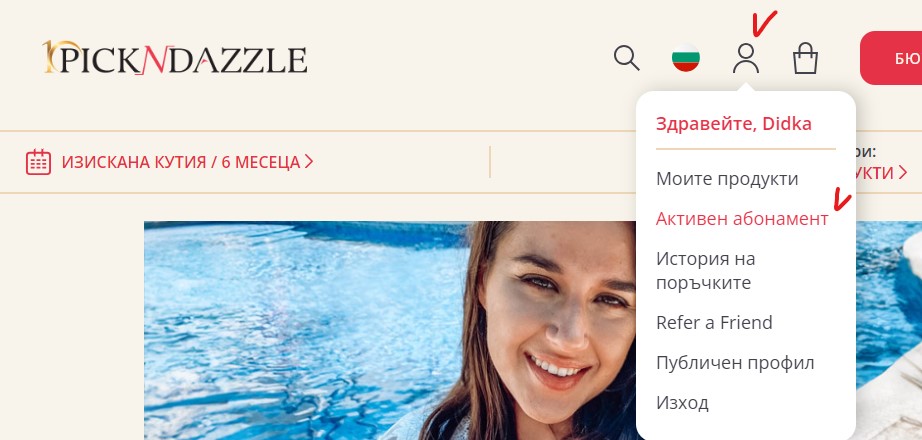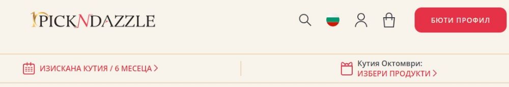 На начална страница www.pickndazzle.com се визуализира линк към абонамента и към следващата кутия за избор на продукти.